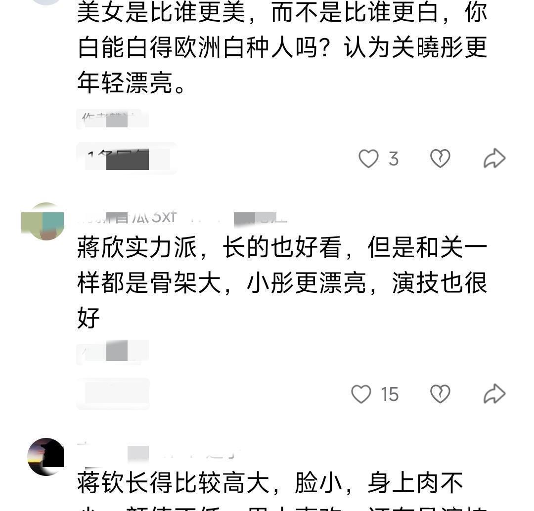 而且作为实力派演员的蒋欣,塑造的角色更让观众印象深刻,包括了《甄嬛传》里的华妃,《小巷人家》里的宋莹等都获得了观众的好评,和关晓彤同框一白一黄的肤色真的对比太明显了。